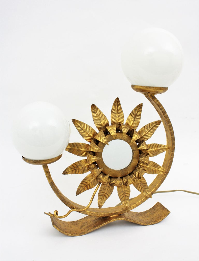 Spanish Gilt Iron Sunburst Vanity Mirror Table Lamp With Milk