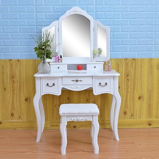 Black White Vanity Makeup Dressing Table With Tri Folding Mirror