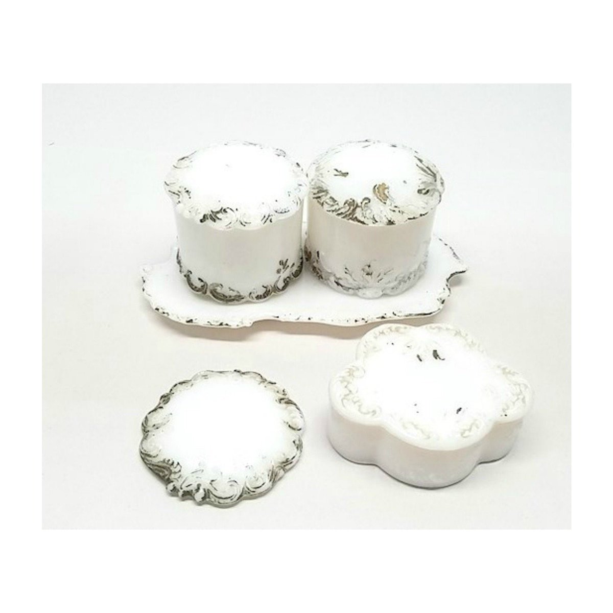 European Porcelain Sterling And Milk Glass Vanity Set Circa 1920
