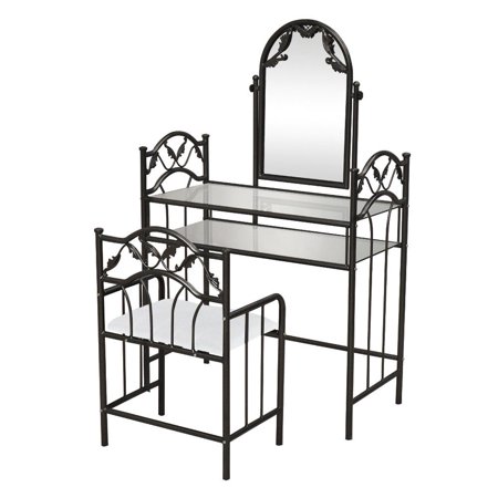 Metal Vanity Set Glass Table Dresser Dark Metal Finish Seat Mirror